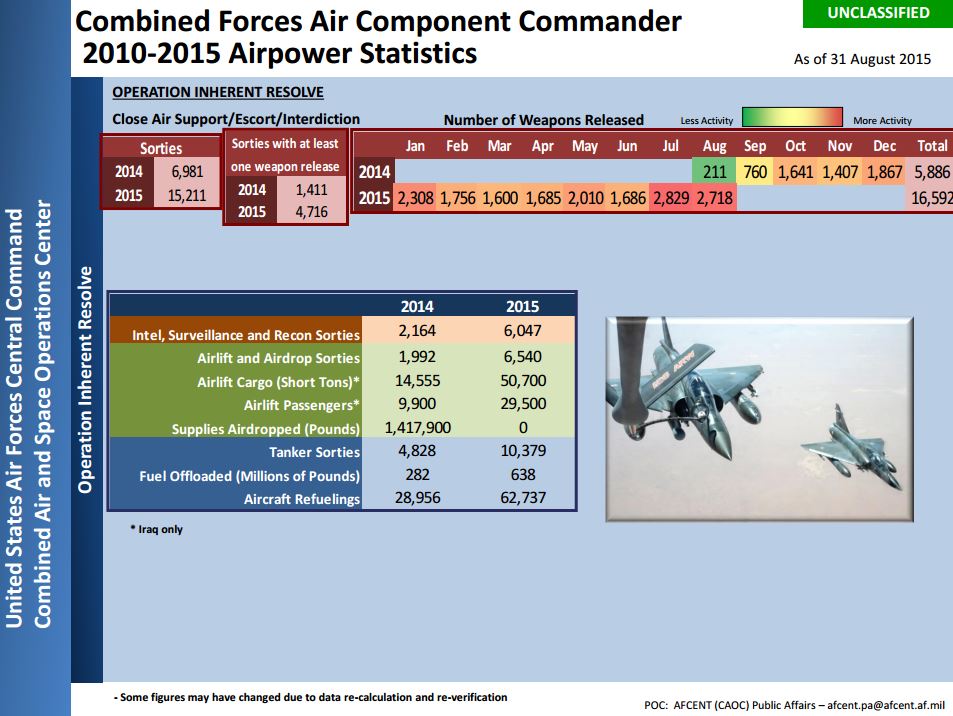 Monthly summary: Below are all known daily coalition military reports relating to the air war against Islamic State in Iraq and Syria for August 2015. We have also included relevant video and photo releases, as well as indicating where alleged civilian or ‘friendly fire’ casualties have been reported.