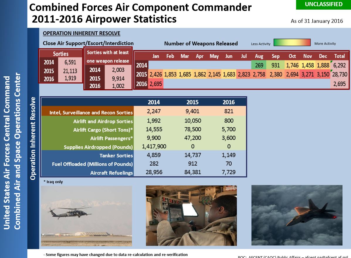 Monthly summary: Below are all known daily Coalition military reports relating to the air war against Islamic State/ Daesh in Iraq and Syria for January 2016. We have also included relevant video and photo releases, as well as indicating where any known alleged civilian or ‘friendly fire’ casualties have been reported.