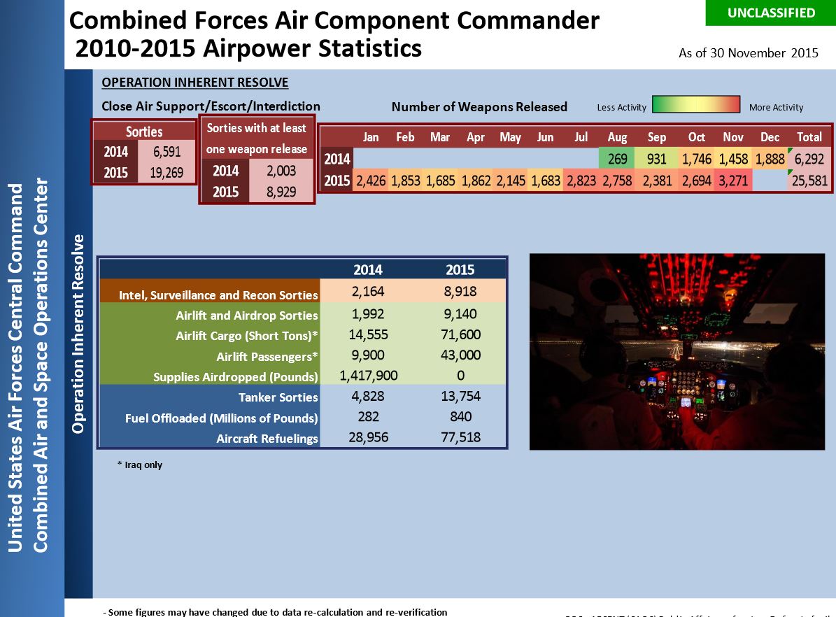 Monthly summary: Below are all known daily Coalition military reports relating to the air war against Islamic State/ Daesh in Iraq and Syria for November 2015. We have also included relevant video and photo releases, as well as indicating where any known alleged civilian or ‘friendly fire’ casualties have been reported.