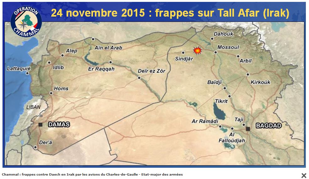 Le lundi 30 novembre 2015 en début de soirée, les chasseurs français de l’opération Chammal ont participé à un raid au-dessus de l’Irak. Situé dans la région d’Al Qaim, l’objectif visé était un site industriel utilisé par Daech pour le stockage d’explosifs et l’assemblage d’engins explosifs improvisés (IED).
