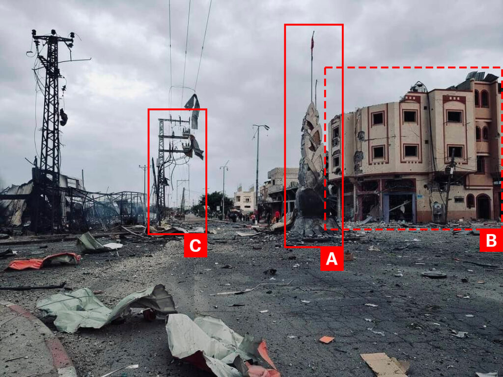 Reports of the incident mention Abasan Al Kabira (عبسان الكبيرة) to the east of Khan Younis (خان يونس). Analysing audio-visual material from sources, we have narrowed the location down to the following exact coordinates: 31.326601, 34.342172.