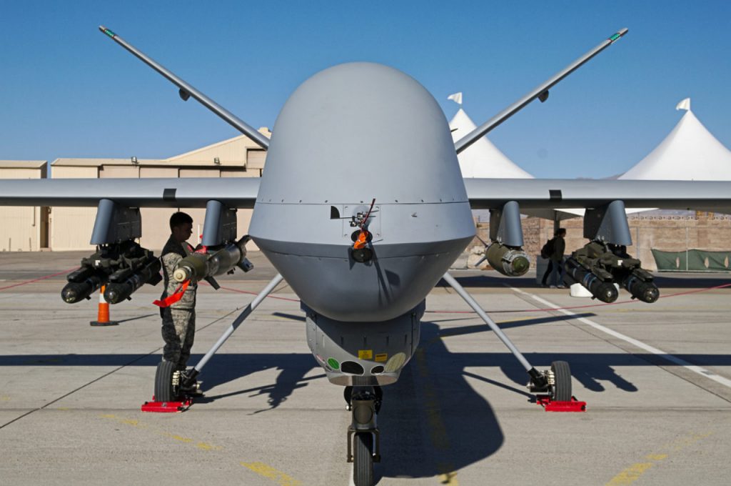 An armed Reaper sits on the apron at Nellis Air Force Base. (cclark395/Flickr)