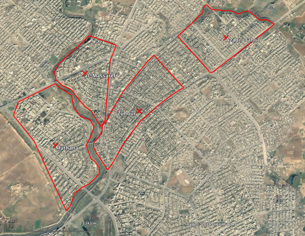 al-Zohour ( حي الزهور ), al-Massaref ( المصارف ), al-Muthanna ( حي المثنى ), al-Tahrir ( تحرير )