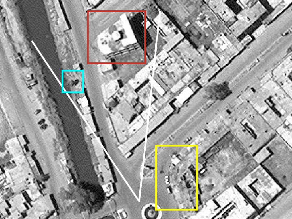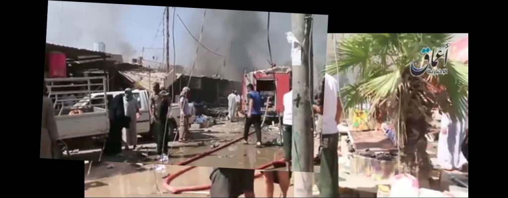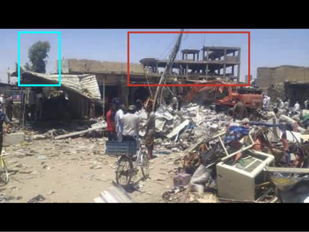 Reports of the incident mention the strike targeted a busy “market”, referred to as the “Great Hawija market,” by BaghdadTV in Hawijah (الحويجة), Kirkuk. Worldakhbar referred to two sites as the “popular market (سوقاً شعبياً) and bridge in the city centre and the regions of Alhsaaa and Aldnades (جسر التحدي وسط المدينة ومنطقتي الحصايا والدناديش).” Possible location of the strike (based on geolocation of images below) is: 35.323967, 43.772852