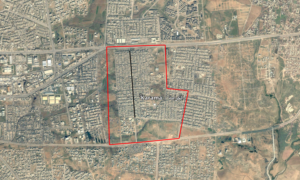 The neighbourhood of Karama (الكرامة) in the east of Mosul, the main street marked in black