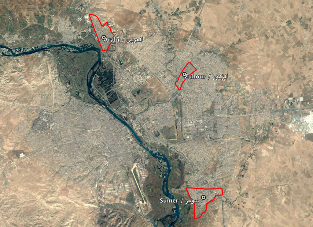 The neighbourhoods of Sumer (سومر), Arabi (العربي) and Zuhour (الزهور) in the city of Mosul