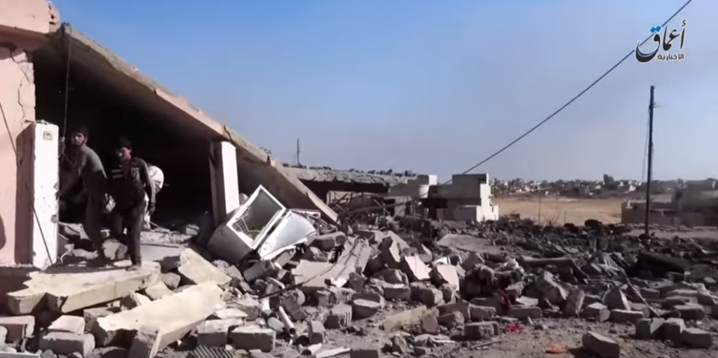 A distressing video posted on Youtube and watermarked with an ISIS-linked logo shows a crumbled building and at least one body lying on the floor covered.