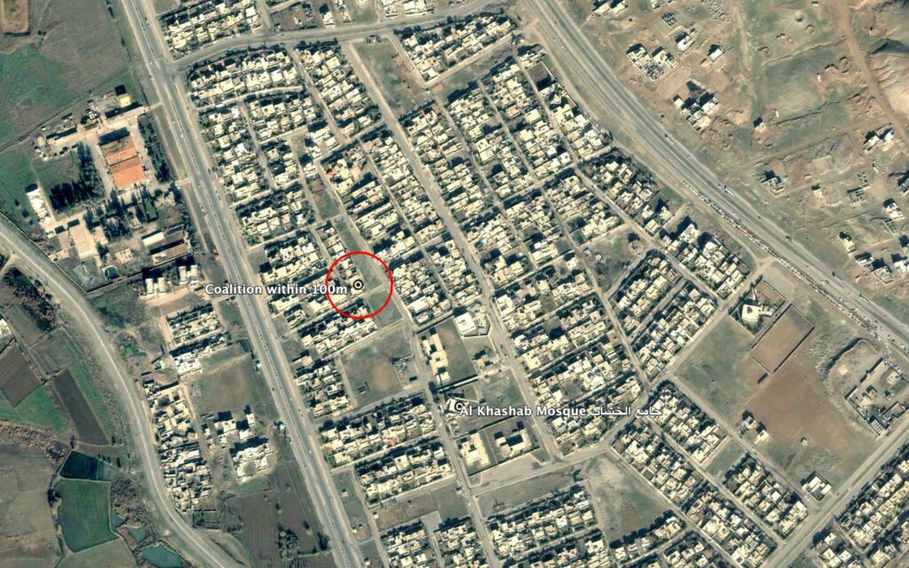 Reports of the incident mention a strike within the vicinity of Al Khashab Mosque (جامع الخشاب). Coalition has confirmed the location of this strike (within 100m), north of Al Khashab Mosque.