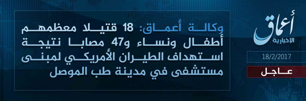 However Iraqi Spring Media Centre and Raedlay (Facebook) later reported “the killing of 18 civilians and wounding 47 others, including women and children, after coalition airstrikes on Medicine # city of Mosul in the right side of the city.” The source for the claim appeared to be so-called Islamic State.