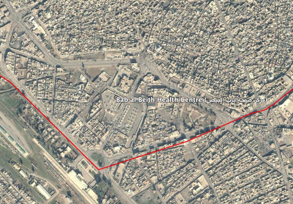 Reports of the incident mention Bab al Beith (باب البيض) area in West Mosul. The coordinates for Bab al Beith Health Centre (مركز صحة باب البيض) are: 36.334444, 43.123889.