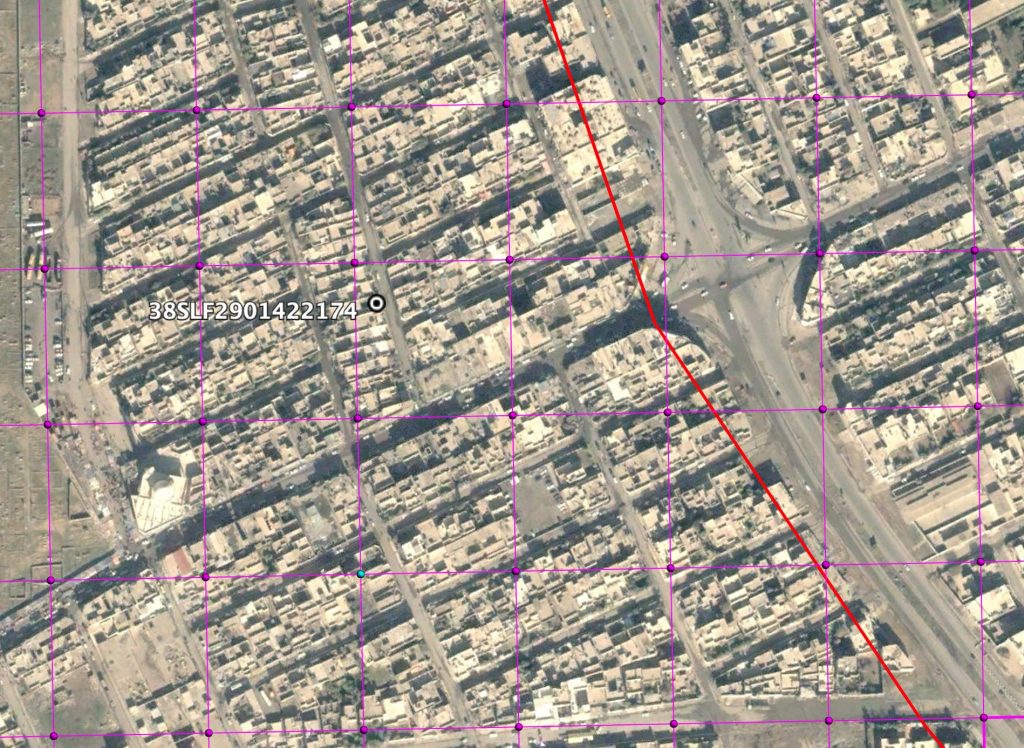 The Military Grid Reference System coordinate (38SLF2901422174), accurate to 1 m, published by the US-led Coalition with their Credible assessment of the civilian harm incident.