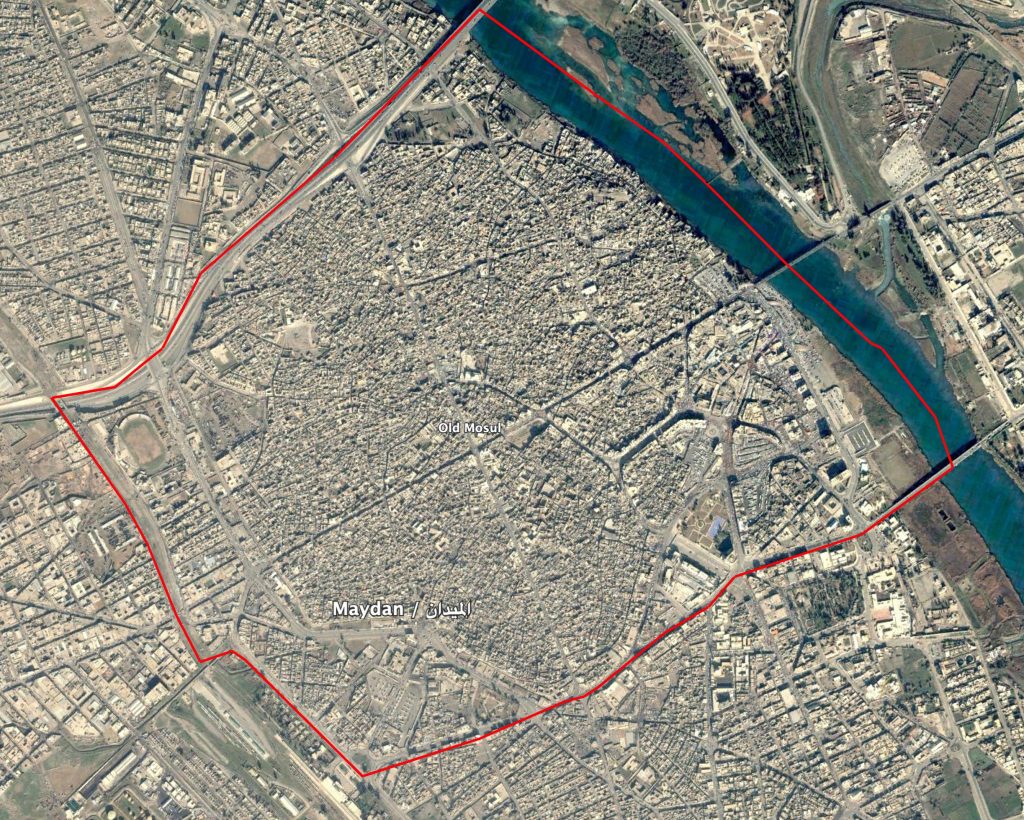 Reports of the incident mention Meydan neighbourhood (حي الميدان) in Old Mosul. Open sources maps indicate Meydan neighbourhood (حي الميدان) is a small area in the North of the Old Mosul, at approximately: 36.336461, 43.124456