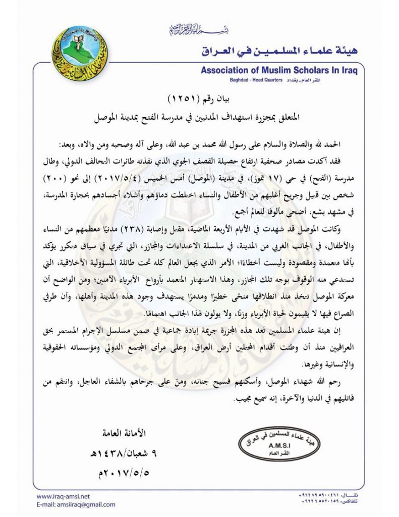 Alrafidain Channel posted a statement written by the Muslim Scholars Association, saying that “the massacre of the July 17 neighborhood in West Mosul, which killed and wounded about 200 people, crime of genocide in the ongoing series of crimes against Iraqis” and that “since the start, the battle of Mosul has been taking a dangerous and devastating direction regarding the existence of this city and its people.” The statement also held that “the parties to the conflict in Mosul do not appreciate the lives of innocent people and pay no attention to this aspect.”