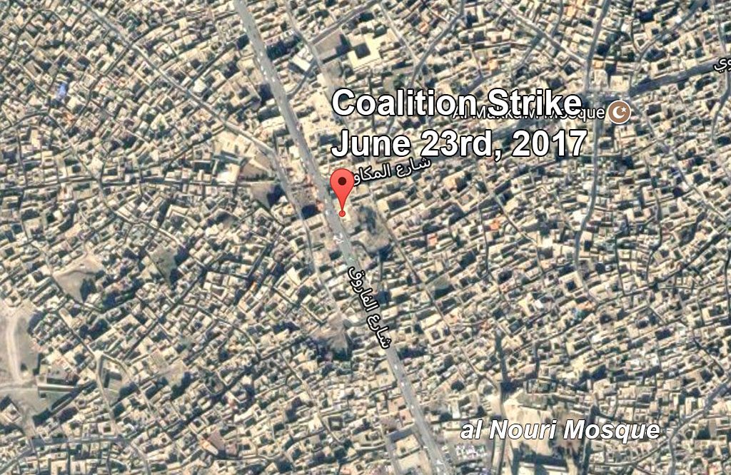 The Coalition provided Airwars with the location of this incident, accurate to within a one-metre box. The location given placed the event near the junction of Al Farouq and Al Makkawi streets.