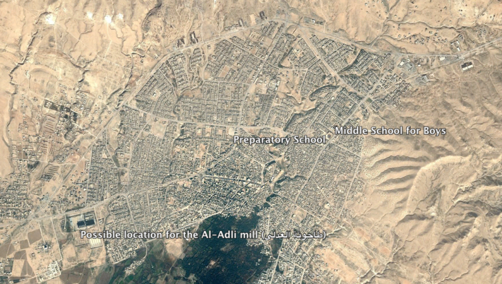 Possible location for the Al-Adli mill (طاحونة العدلي), the Al-Tal Afar Preparatory School (إعدادية تلعفر) and the Tal Afar Middle School for Boys and Secondary Dhi Qar Evening (متوسطة تلعفر للبنين وثانوية ذي قار المسائية)