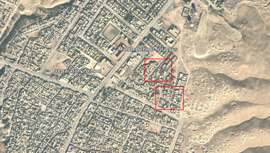 Reports of the incident mention a number of locations within the city of Al-Tal Afar (تلعفر): Al-Sadiq al-Ameen Preparatory (إعدادية الصادق الأمين), which Airwars was unable to locate, however the location for Al-Tal Afar Preparatory School (إعدادية تلعفر) can be seen below; Al-Nada neighbourhood (حي النداء); the Al-Adli mill (طاحونة العدلي), which Airwars was unable to locate, for a possible location see below, and the village of Al-Alu (قرية العلو). Satellite imagery available to Airwars of July 27, 2017 and August 4, 2017 (a 13 day window) shows structural damage at the location of the Al-Tal Afar Preparatory school (إعدادية تلعفر), for which the coordinates are: 36.378889, 42.462778