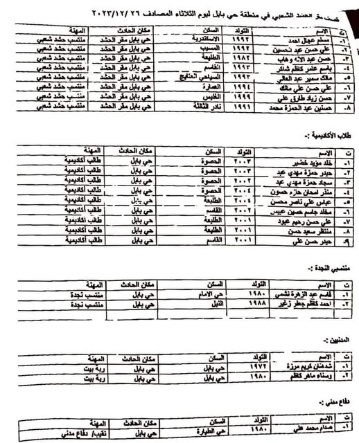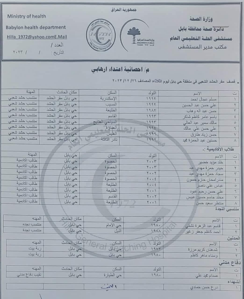 One independent journalist, Yasser Al Shommari, posted a list of names of those harmed as a result of the airstrike, including members of the police, the Hashd and civilians. The two civilians injured were described as two “housewives”: Shadhadan Karim Mirza and Wasnah Maher Kahem, born in Babel in 1972 and in 1971 respectively. On December 26th, the news website ‘Jabla Al Khair’ also posted an image showing a Babylon Health Department document (Ministry of Health). This document contained the names of those who had been wounded in the airstrike (including Shadhadan Karim Mirza and Wasnah Maher Kahem), in addition to the name of the one individual known to have been killed.
