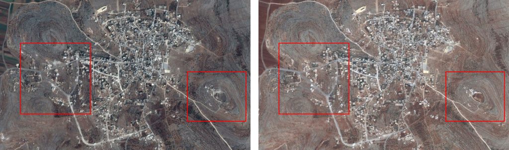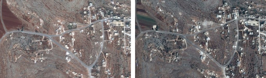 West of the village of Tawama (التوامة), showing visible structural damage (left: 26 August, 2014; right: 29 April, 2016)