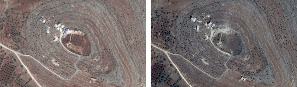 East of the village of Tawama (التوامة), showing visible structural damage (left: 26 August, 2014; right: 29 April, 2016)