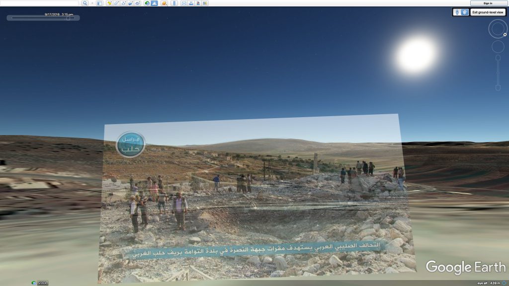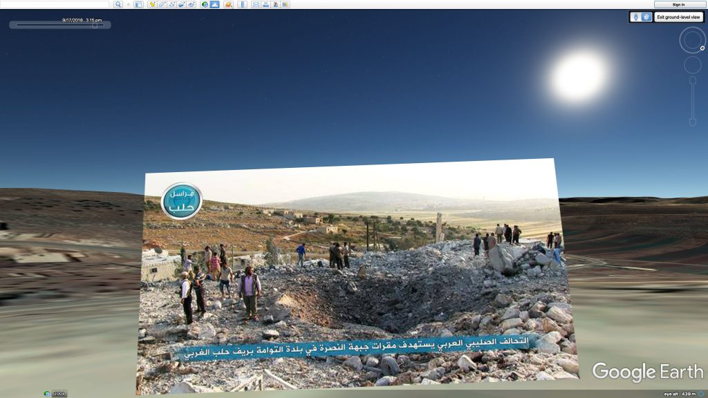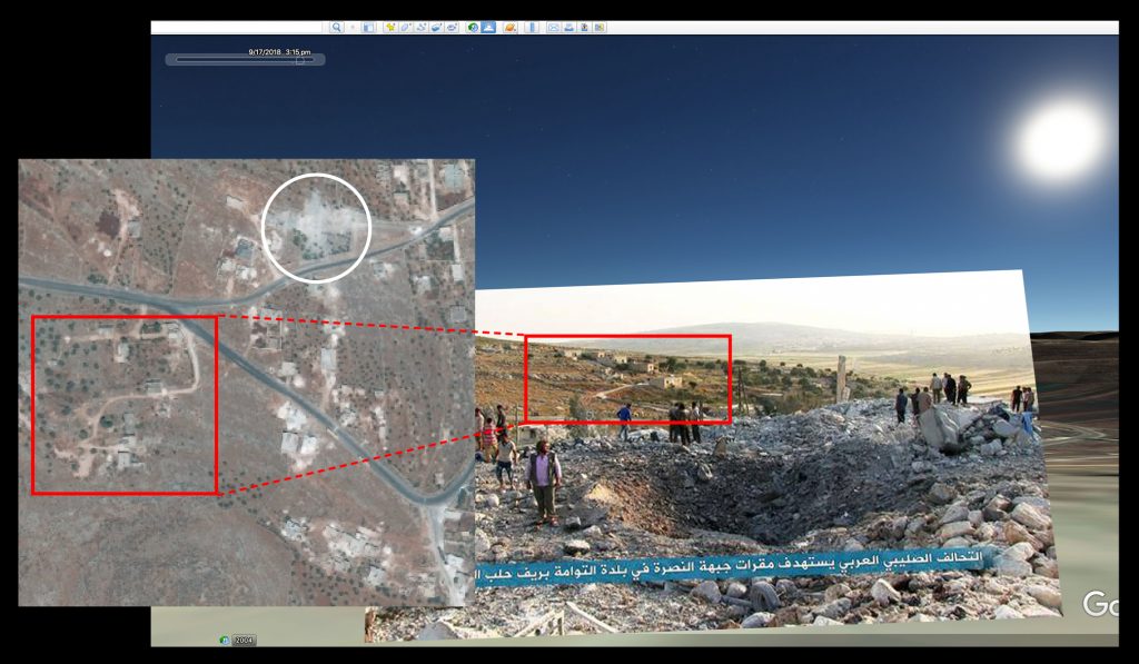 Reports of the incident mention the village of Tawama (التوامة), of which the coordinates of its midpoint are: 36.19327, 36.80928. Satellite imagery from April 2016, taken 10 months after the incident, shows visible structural damage in the area, in comparison to satellite imagery taken prior to the incident. In addition, using Google Earth Terrain ground view, Airwars was able to geolocate images provided by media, further verifying the location of the incident.