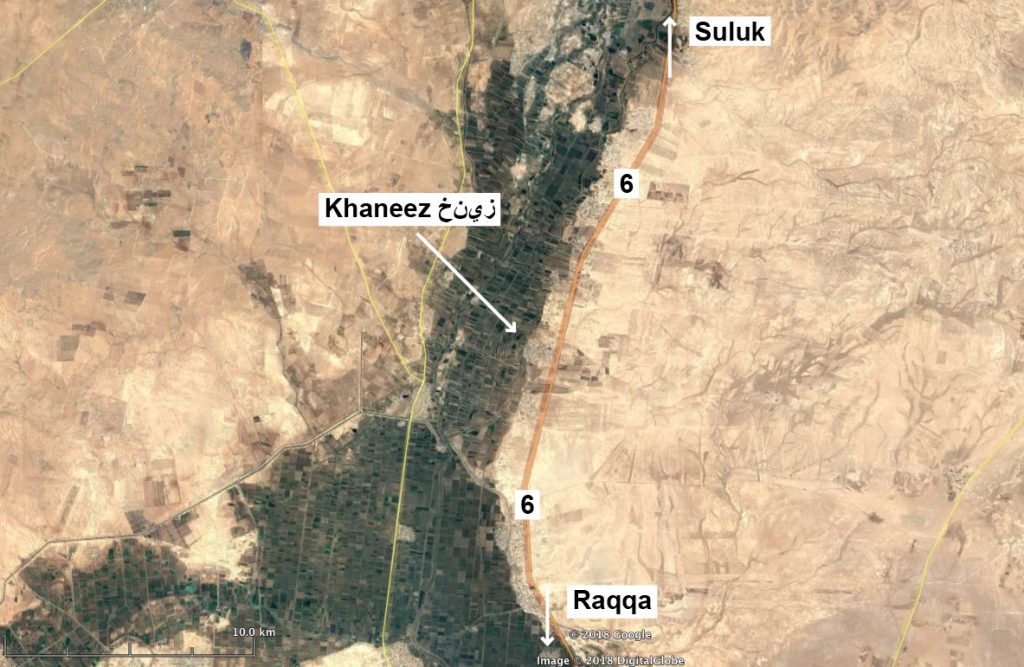 Reports of the incident mention an area in the vicinity of the village of Khaneez (خنيز or خنيزر جنوبي), on the road between Suluk (سلوك) and Ar Raqqah, known as Route 6. The coordinates for the area on Route 6 that is West of the village of Khaneez (خنيز) are: 36.2451039, 39.0351105