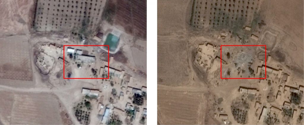 Structural damage shown on satellite imagery (left: 18 May, 2014; right: 8 May, 2016)