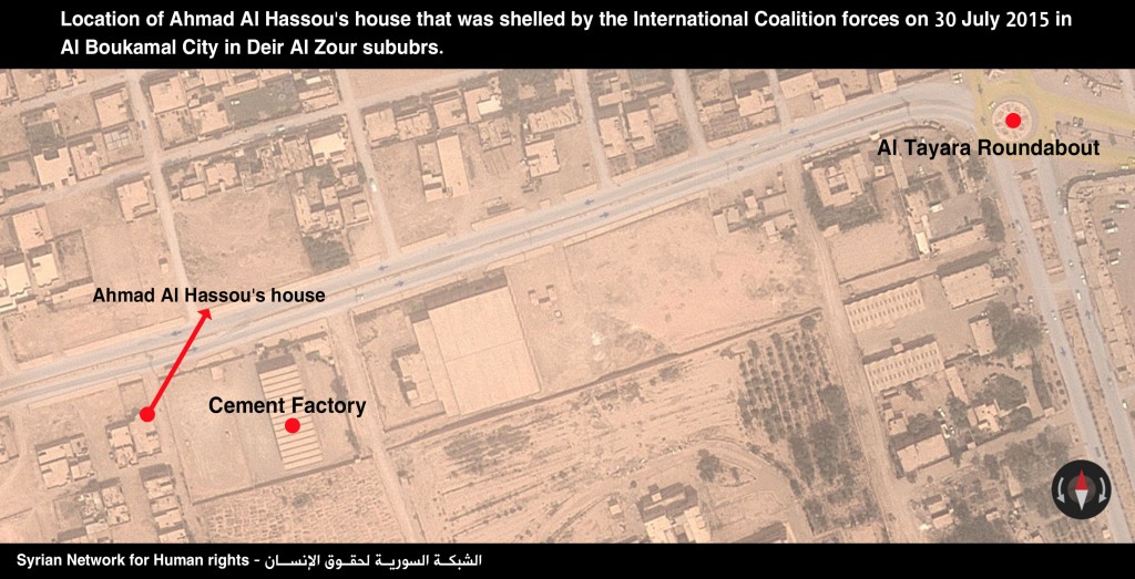 The Syrian Network published a later investigation, citing an eyewitness it named as Mr. Alaa: “I woke up at the sound of an explosion at about 1:30 a.m…. I went to the building’s roof to see what happened, and I was able to estimate the shelling location. It was near the cement factory and I heard the people’s screams. I went directly to the shelling location and saw great destruction. One of the rockets fell in the middle of a road next to a 2 story building, while the other fell in the middle of that house. Blood and body parts were scattered on the walls and on the road. The victims were transported to the hospital and I tried to enter it too but ISIL’s members prohibited us due to the fear of another airstrike. I heard that 5 individuals from Hasso family were killed in the shelling.”