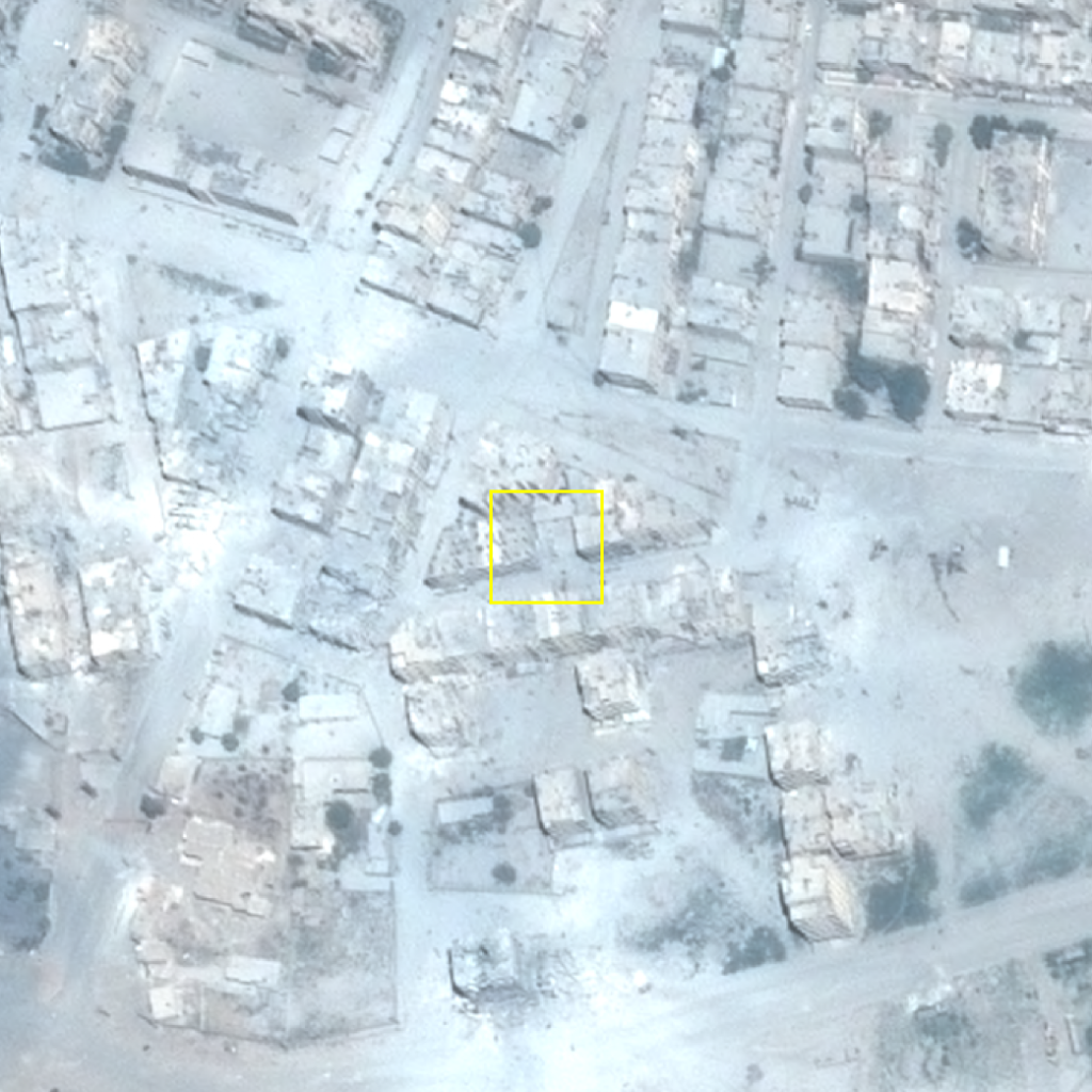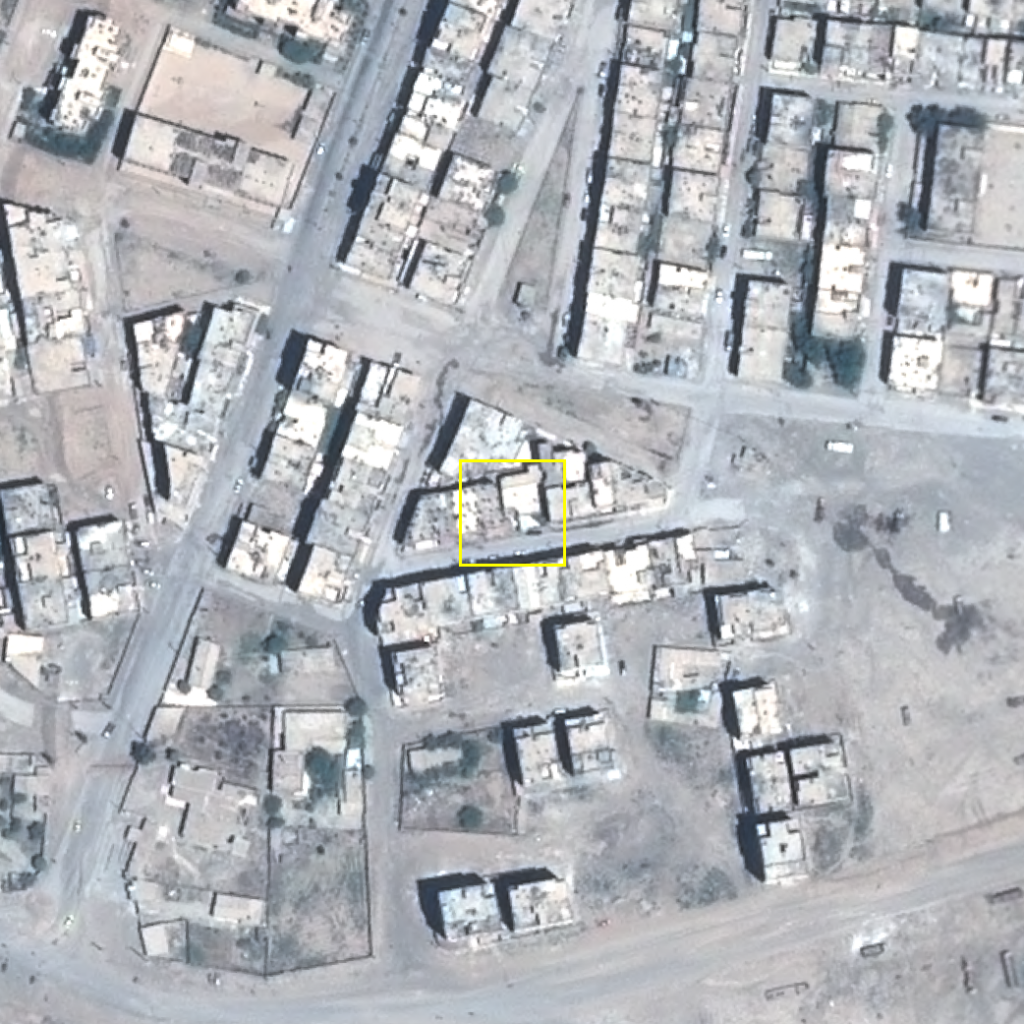 The precise location as reported by Amnesty International field-notes reported an unmarked building was struck. This was the only small house surrounded by tall buildings and it was direct hit on the house.