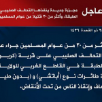 Up to 20 adult civilians were reported killed and injured alongside 15 children after Coalition aircraft reportedly bombed forcibly-engaged civilians who were being forced to dig ditches by Islamic State. The children reportedly belonged to ISIL’s Cubs of Al Khilafa youth organisation. The casualties occurred in the morning at the village of Krin, west of Tabaqah, alongside an estimated 50 Daesh fighters.