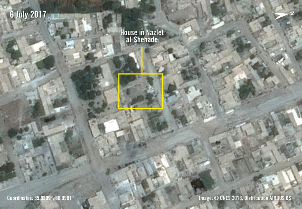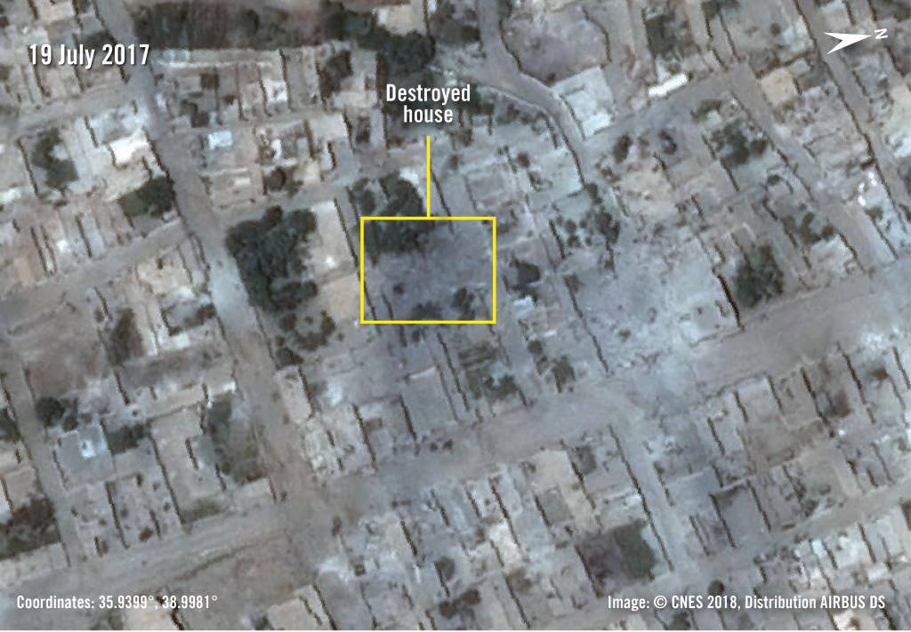 According to the Amnesty/Airwars research the coordinates of the house: 35.93988, 38.99818, while the coordinates of the street that also was struck were 35.939944, 38.998272.