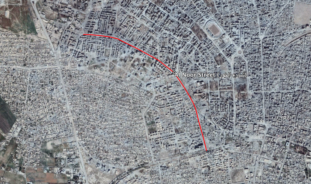 Reports of the incident mention Al Noor Street (شارع النور), Raqqa, for which the coordinates are: 35.9520, 39.0008.
