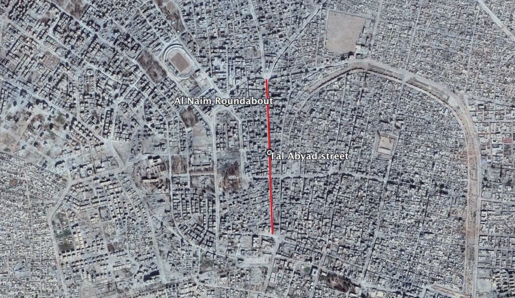 Reports of the incident mention several areas in the city of Raqqa: the area around the Na’im (ﻣﻨﻄﻘﺔ ﺍﻟﻨﻌﻴﻢ) roundabout, for which the coordinates are: 35.95447, 39.009392; Tal Abyad street (ﺷﺎﺭﻉ ﺗﻞ ﺃﺑﻴﺾ), for which the coordinates are: 35.948534, 39.012615; and Al Salam hospital (مشفى السلام), for which the location is unknown to Airwars. Prior to the Coalition releasing the MGRS for this incident, Airwars had geolocated it to the nearest neighbourhood/area at 35.95447, 39.009392.