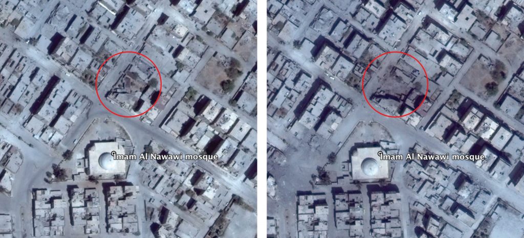 Damage to a residential building near the Imam Al Nawawi mosque (left: August 7, 2017; right: August 13, 2017)
