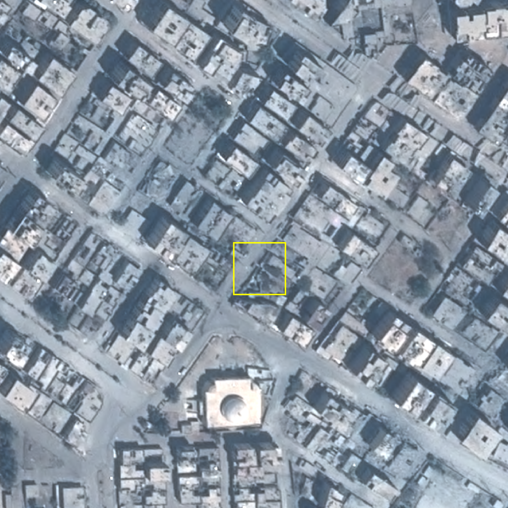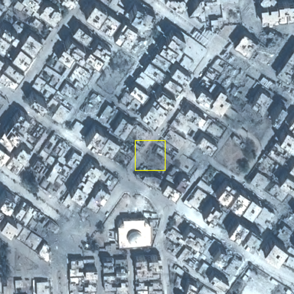 Reports of the incident mention a residential building was targeted near the Imam Al Nawawi mosque. The coordinates for this mosque are: 35.956324, 38.999290. Based on images published by RBSS (4th image above) Airwars was able to establish the exact coordinates of the building that was struck through geolocation: 35.957190, 38.999660. Damage to this building can be seen on satellite imagery of August 13, 2017. The Amnesty and Airwars’s joint April 2019 report “War in Raqqa: Rhetoric versus Reality” reported that this coordinate was incorrect alleging that coordinates were of the building across the street. The photo of house with yellow walls is not the right house. The garden however is. In reality the street was targeted and said victim was killed by artillery shrapnel while in her house. The house which Airwars has geolocated is the same house where a small impact radius missile killed four men on the 27th September 2017. See incident CS1536. According to Amnesty not much damage was done to the house.