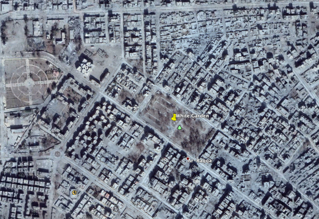 Reports of the incident mention the White Garden (الحديقة البيضا) area of Raqqah, for which the coordinates are: 35.9605703, 38.9976883.