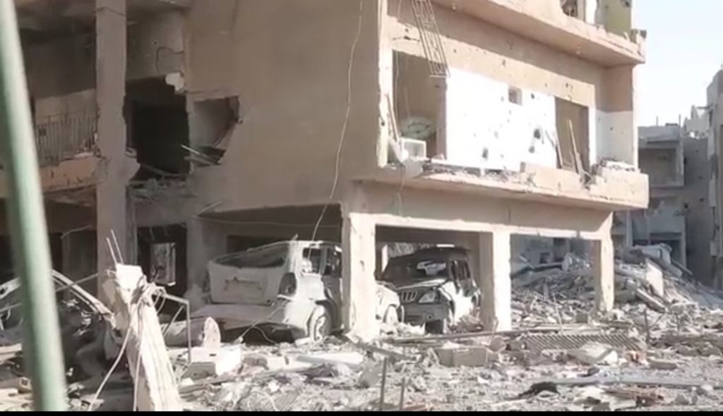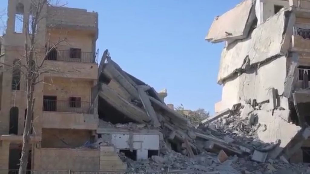 Structural damage seen in the neighbourhood of Al Bedou (حارة البدو), at: 35.963119,39.003409 (left: 13 August, 2017; right: 25 August, 2017)