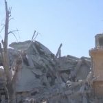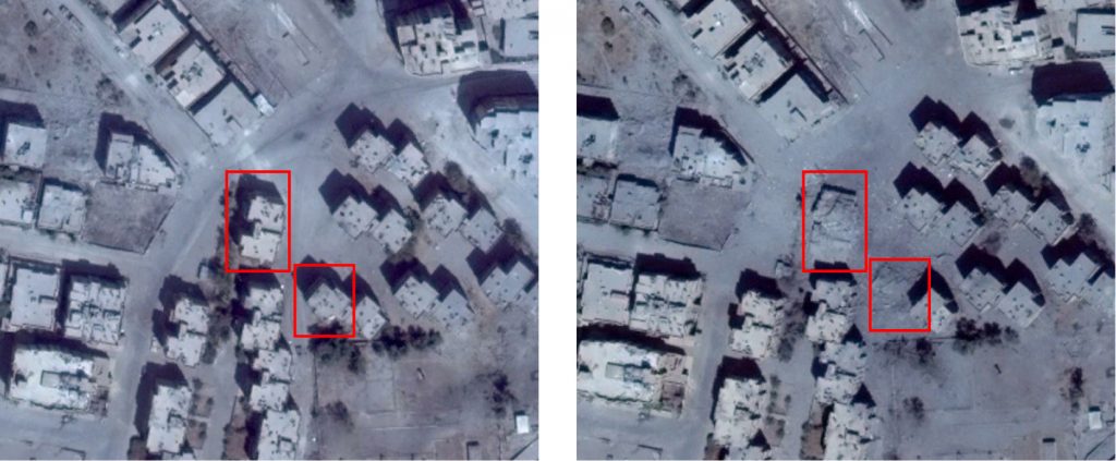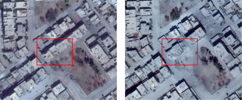 Structural damage seen in the neighbourhood of Al Huni, at 35.952789, 39.002935 and 35.952589, 39.003187 (left: 13 August, 2017; right: 25 August, 2017)