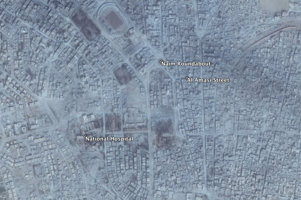 Reports of the incident mention multiple locations being struck in the city of Ar Raqqah (الرقة). These are the National Hospital, the vicinity of Naim roundabout, and Al Amasi street