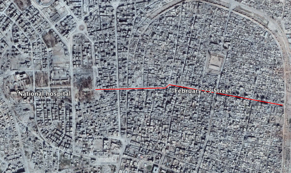 Reports of the incident refer to the National Hospital, for which the coordinates are: 35.949994, 39.003815. Syrian Network for Human Rights report mentioned “February 23 Street”, which is 500 m from the hospital compound.