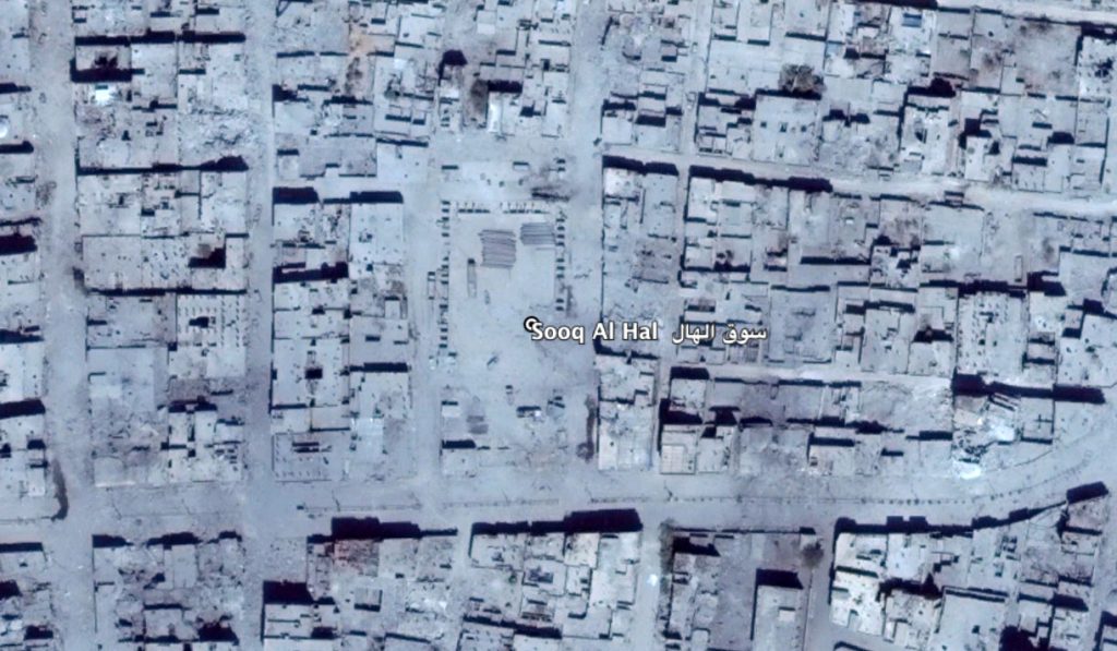 Reports of the incident mention Sooq Al Hall (سوق الهال) area, for which the coordinates are: 35.950765, 39.014393. There are two markets referred to as Al Hall (سوق الهال) in Raqqa city, however, given the date of the incident, it is unlikely that there was fighting near the other Sooq Al Hall (سوق الهال), for which the coordinates are: 35.937528, 39.027740. Furthermore, satellite images from take on Aug. 25 and Sept. 06, 2017 indicate no new damage there. Amnesty research found the precise location of the strike: 35.95243, 39.01633.