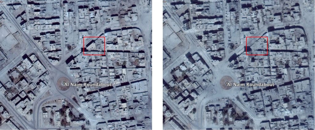 Reports of the incident mention that the alleged Coalition airstrike targeted a building near the Al Naim roundabout (دوار النعیم), in the city centre of Raqqa, for which the coordinates are: 35.95447, 39.009392. There is visible damage of a tall building in the vicinity of the roundabout, between August 25 and September 9, 2017. The coordinates for this building are: 35.955538, 39.010416. However, Amnesty research reported the precise location of the strike: 35.95432, 39.00985.