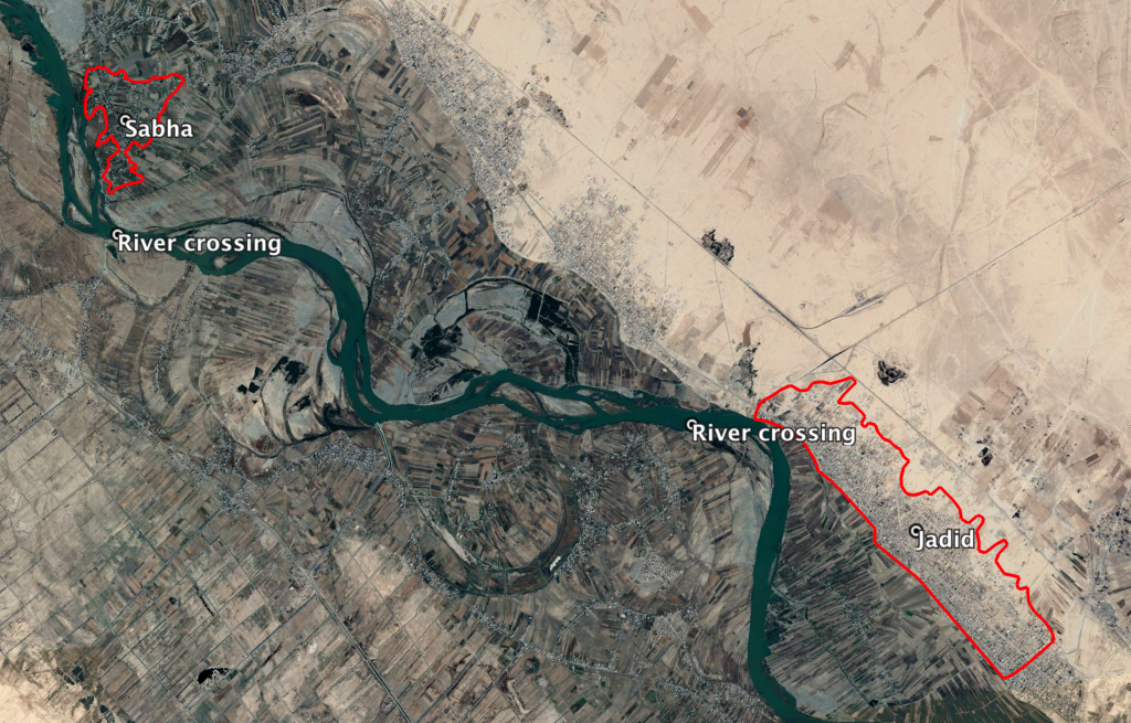 Reports of the incident mention the Sabha and Jadid river crossings (معبر صبحة والجدید). Two possible locations for these river crossings are: 35.258358, 40.330682 (Jadid) and 35.284181, 40.234852 (Sabha)