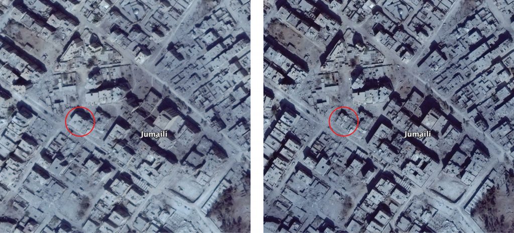 Structural damage seen in the neighbourhood of Jumaili (الجمیلي) (left: September 6, 2017; right: September 19, 2017)