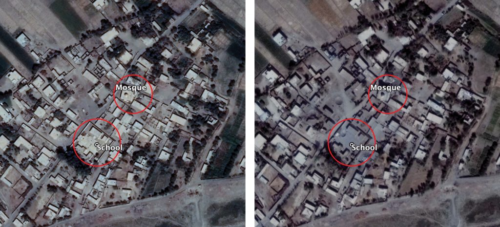 Traces of airstrikes seen near and on the school and mosque in the village of Mazloum Tahtani (مظلوم تحتاني) (left: September 3, 2017; right: September 30, 2017)