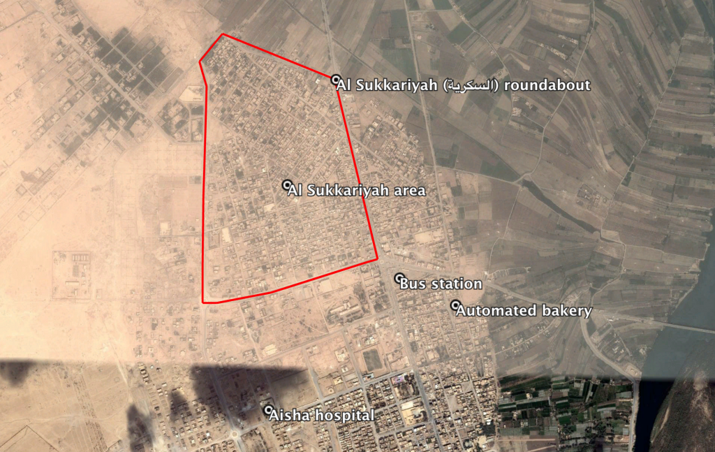 Reports of the incident mention the area of Al Sena’a (الصناعة) (industrial neighbourhood) in the city of Abu Kamal (البوكمال). Airwars was unable to verify the location of this neighbourhood, however, a number of specific locations was mentioned in the countryside of Abu Kamal: near the automated bakery, according to Euphrates Post (34.465674, 40.918536); the Al Sukkariyah (السكریة) roundabout area (34.476270, 40.911713, see also incident CS1501); areas near the bus station (34.466939, 40.915339) and the vicinity of the old and Aisha hospital (34.460755, 40.907872).