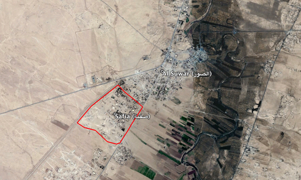 Reports of the incident mention that the alleged Coalition airstrike targeted the neighbourhood of Safia (صفیة) in the southern outskirts of the village of Al Suwar (الصور), northern Deir Ezzor. The coordinates for this neighbourhood are: 35.494709, 40.644693.