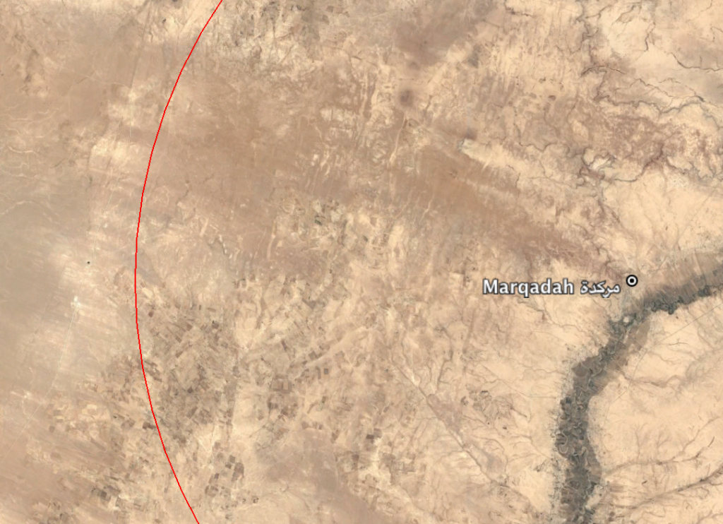 Marqadah (مركدة) village and countryside to the West, with a 30 km radius marked in red.
