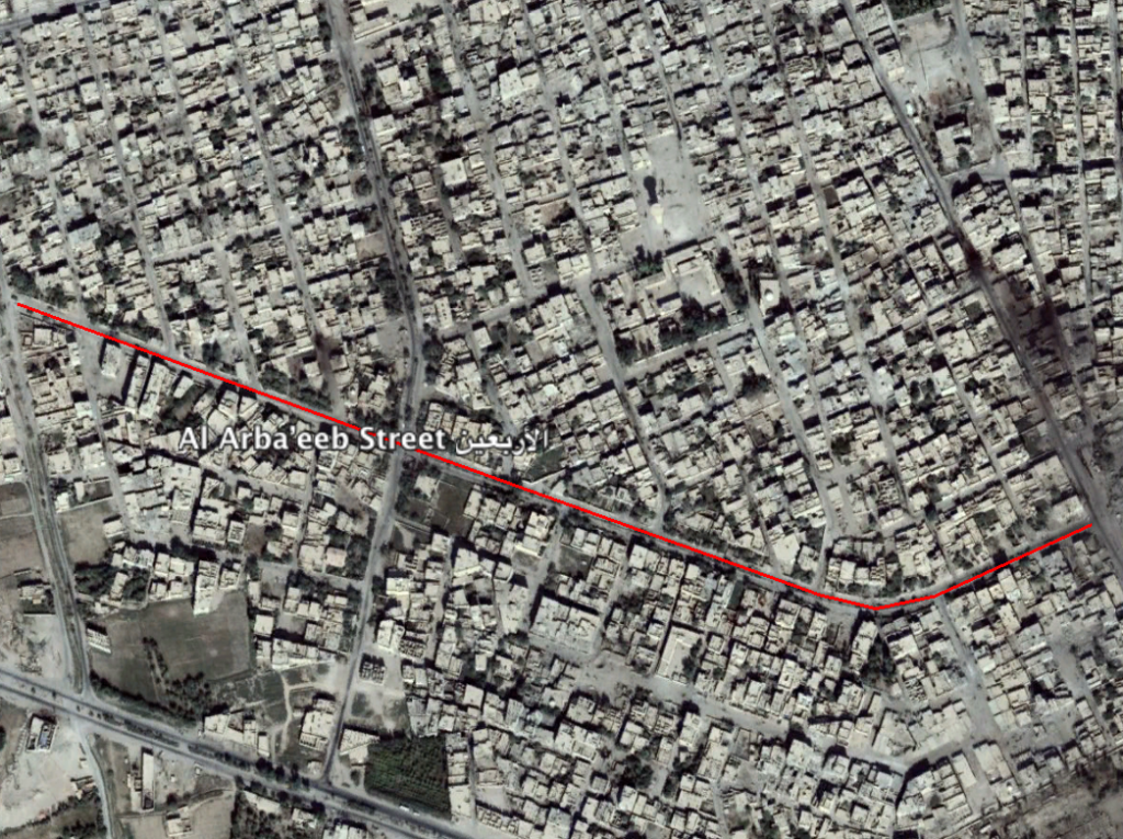 Reports of the incident mention Al Arba’eeb Street (الأربعین) in Al Mayadin city. Open Source maps give a possible possible for Al Arba’eeb Street (الأربعین) at: 35.017721, 40.447309.