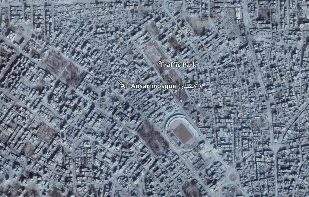 Airstrikes struck residential buildings close to the Traffic park near the Al-Ansar mosque (الأنصار)