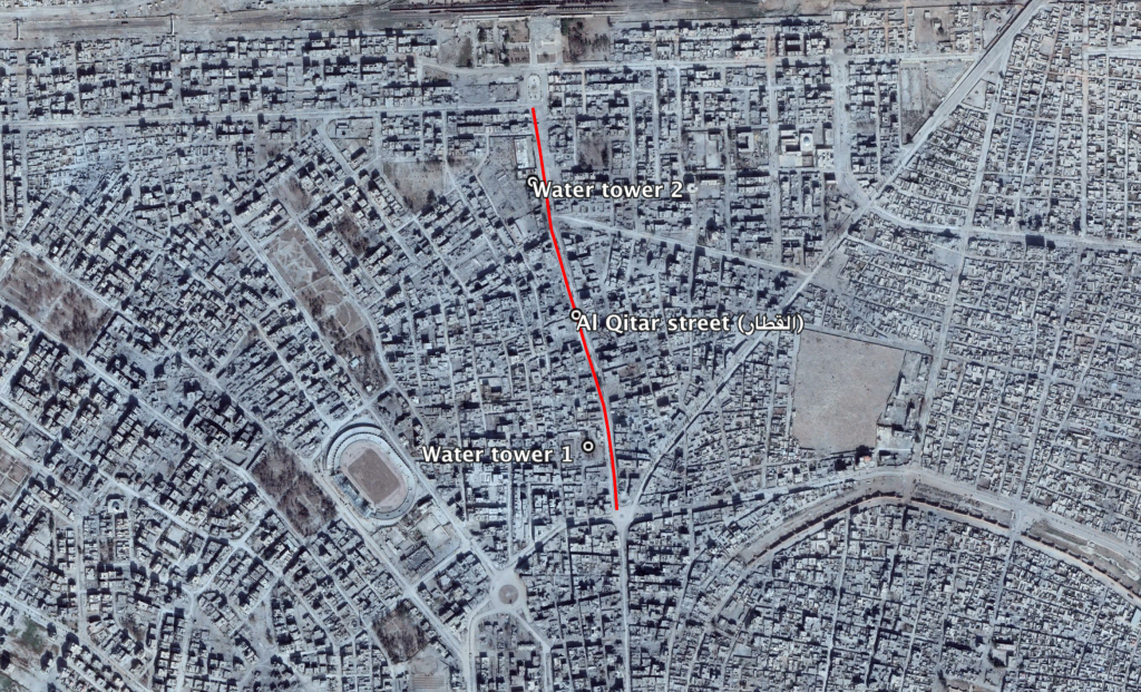 Reports of the incident mention a water well on Al Qitar street (القطار). This could refer to a water tower at a water company or administration on that street, located north of the city centre on the outskirts of the neighbourhood of Al Tawassiya (التوسعیة). This was one of the few remaining water towers that was not destroyed at that time, the coordinates for this water tower are: 35.957566, 39.011378. A second water tower on Al Qitar street was also still standing, the coordinates for this tower are: 35.963037,39.009959. In addition, other sources mention a “water well in Al Hadiqa Al Bayda which is in Al Tawassiya (التوسعیة) area”
